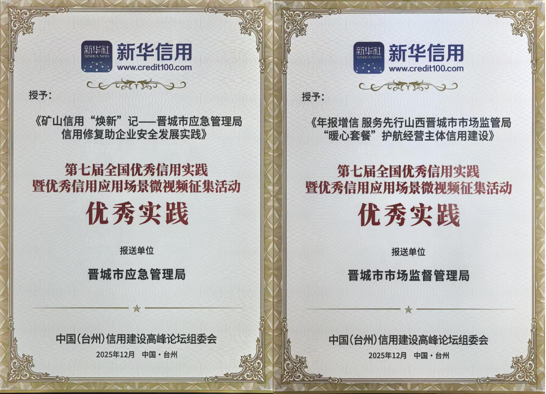 近日,第七届中国(台州)信用建设高峰论坛传来喜讯:我市选送的《矿山信用“焕新”记——晋城市应急管理局信用修复助企业安全发展实践》《年报增信 服务先行山西晋城市市场监管局“暖心套餐”护航经营主体信用建设》两项案例,双双获评“第七届全国优秀信用实践暨优秀信用应用场景微视频征集活动优秀实践”。